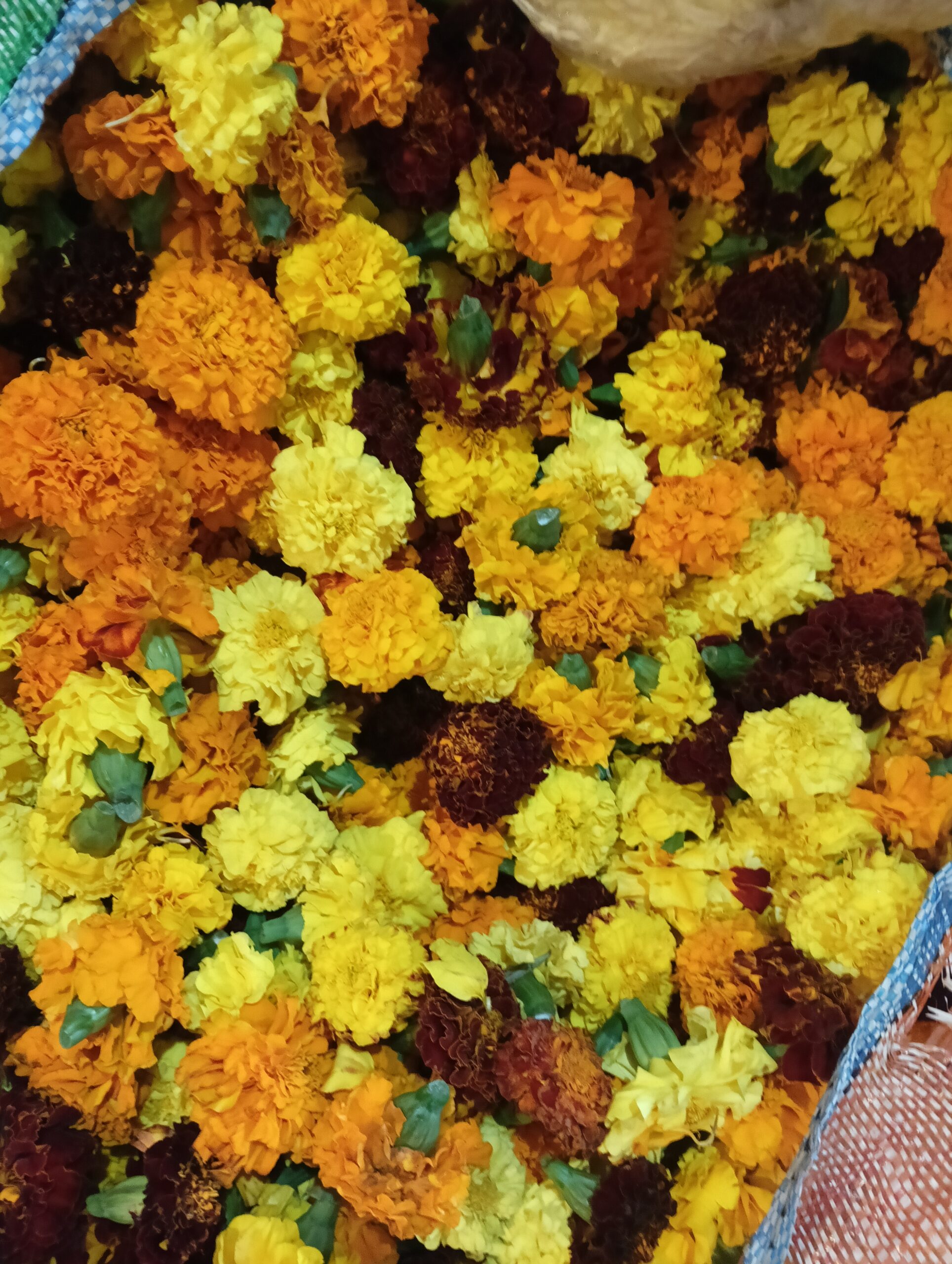 Fresh mixed marigold flowers in bright yellow and orange shades, perfect for pooja, decoration, garlands, and festive celebrations.