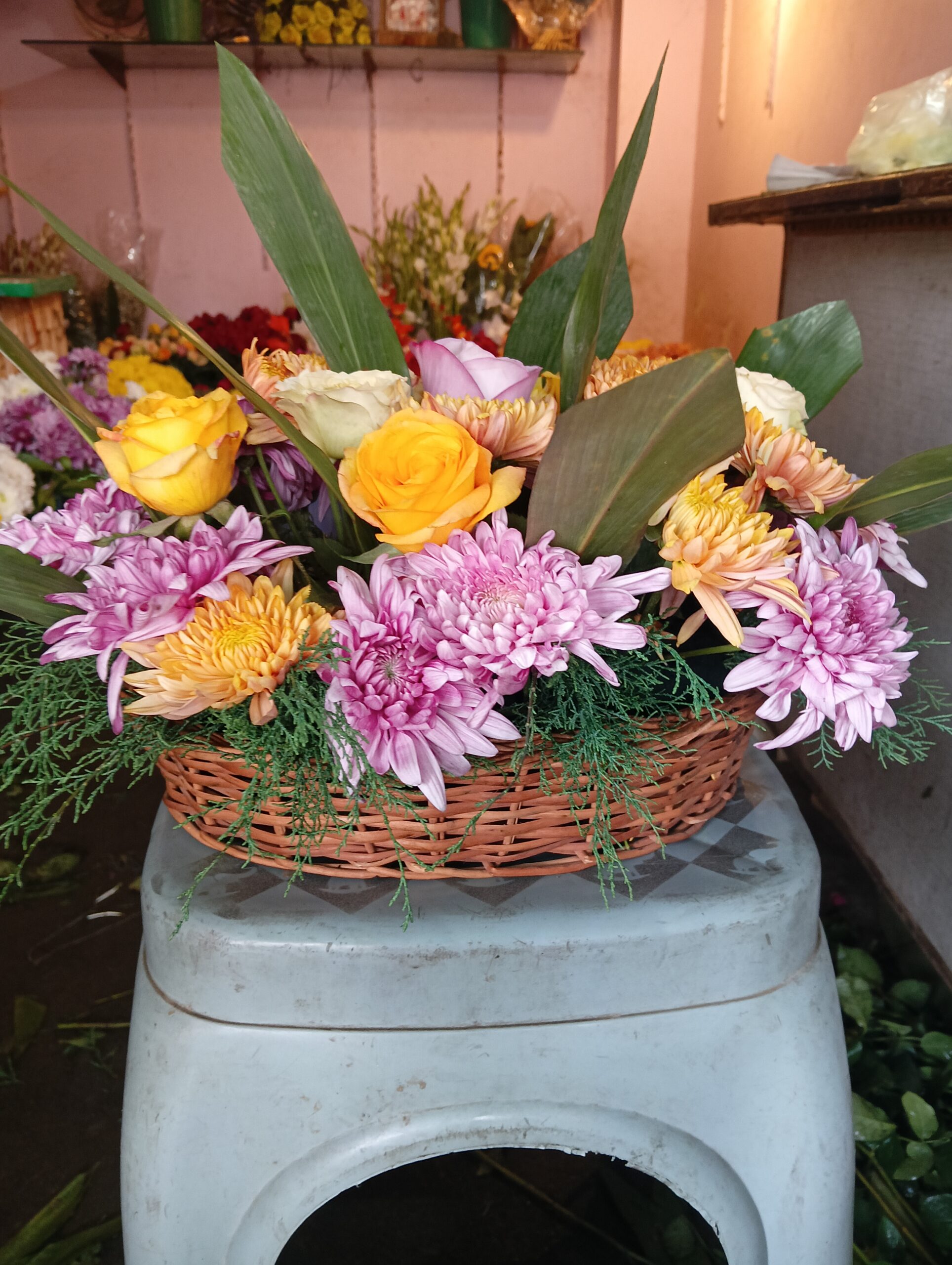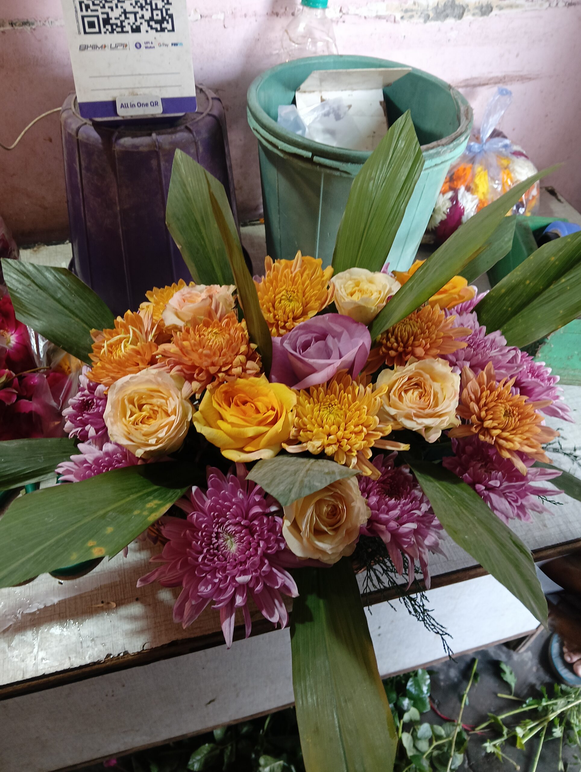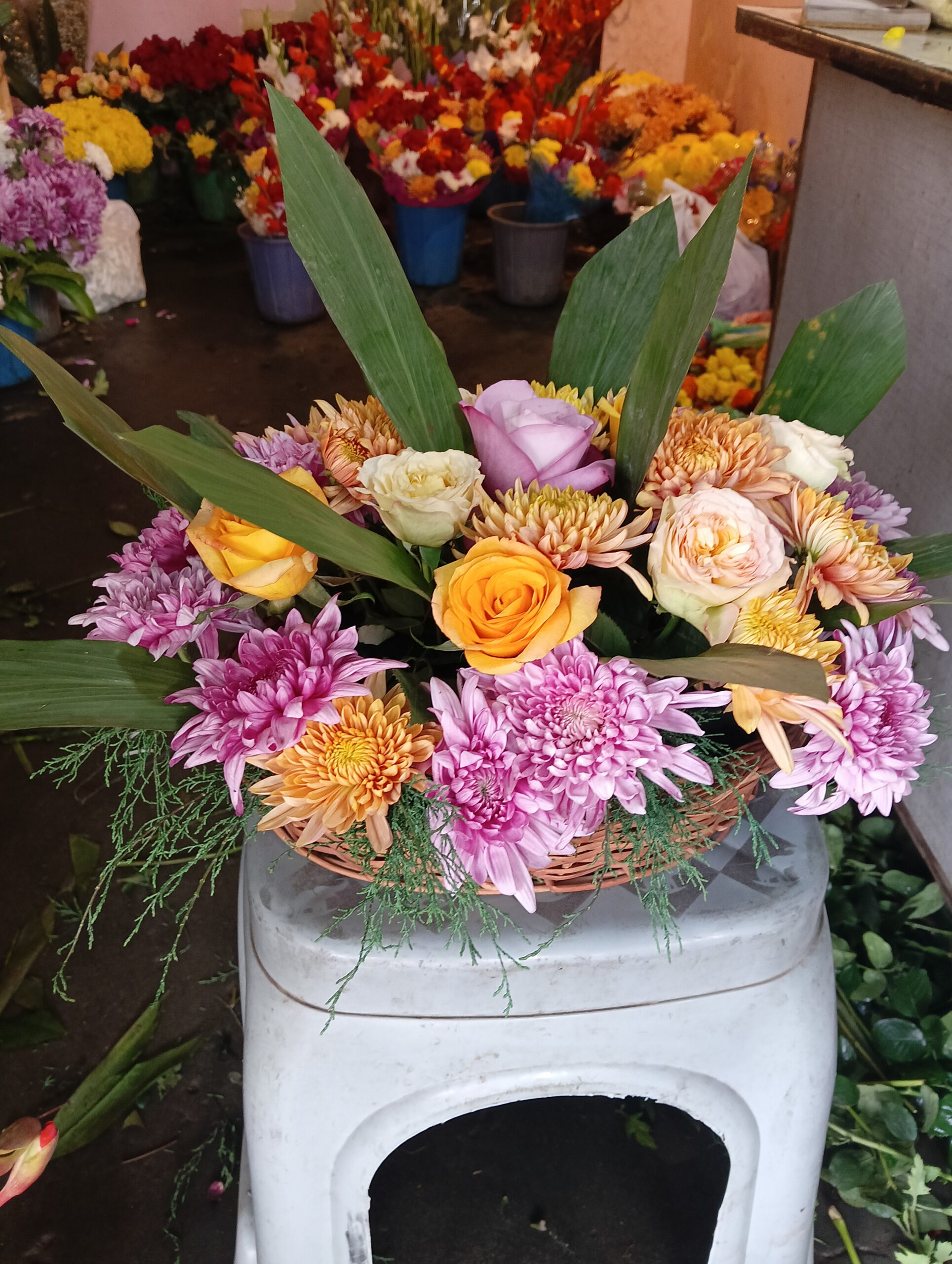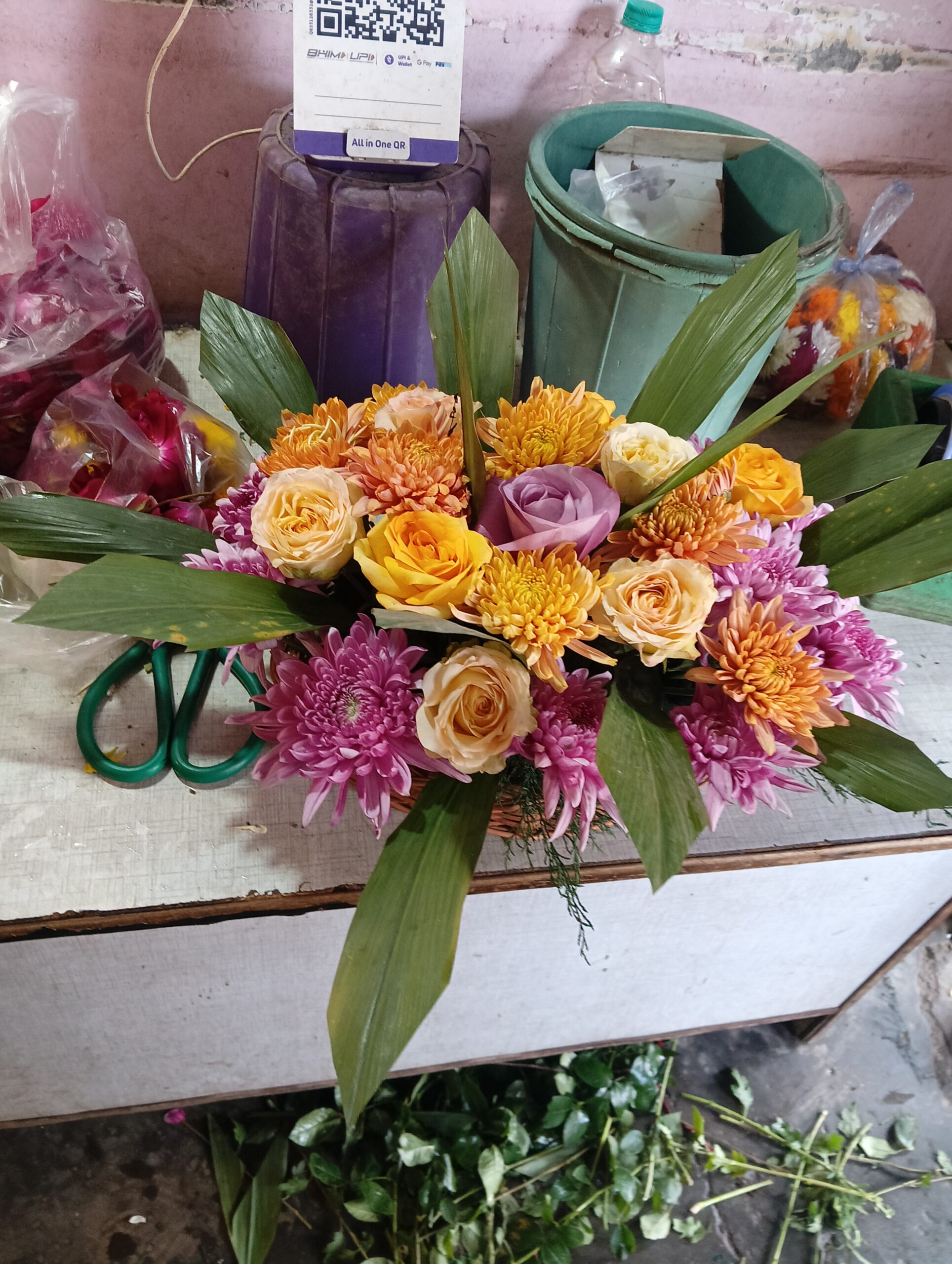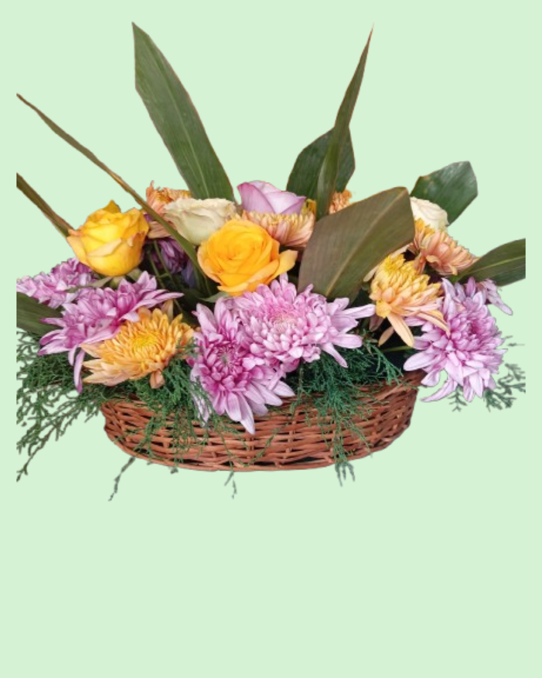Bring freshness and elegance to any occasion with this beautiful mixed flower bouquet, thoughtfully arranged in a decorative basket. Made with fresh roses, chrysanthemums, and seasonal flowers along with lush green leaves, this bouquet adds charm and positivity wherever it’s placed.